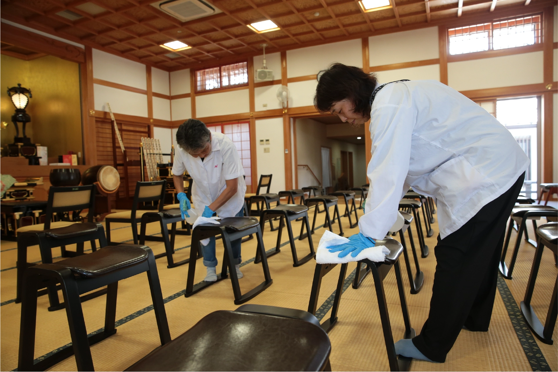 私達は、塔中坊の本堂・広間・廊下など室内の清掃や、外周、庭園など屋外の清掃を、日常の業務として行っています。