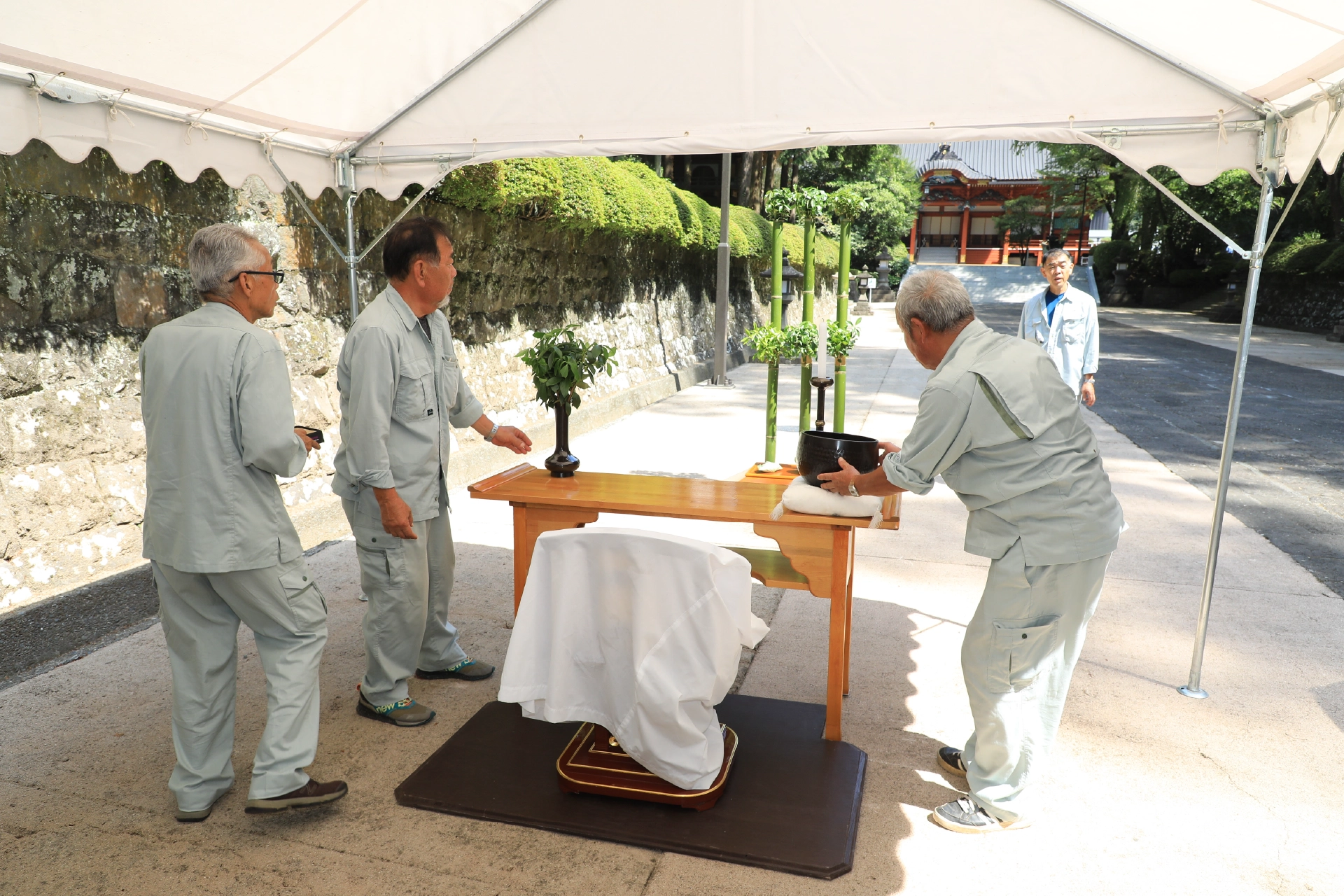 そのままにしておくと苔が生え、滑って危ない境内の石畳は、参詣者の安全のため、時は高圧洗浄機などの道具も使いながら、時期によっては毎日坦々と洗い続けます。安全に配慮しつつ炎天下での作業になることもありますが、例えば、広い客殿前広場をすべて洗い終えたあとに、きれいになった石畳を見渡せば、登山参詣者の安全を守れたこと、その達成感と底知れぬ充実感をおぼえることもあります。